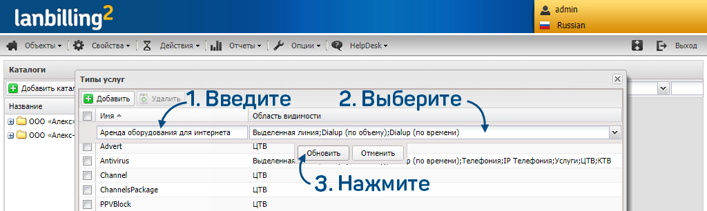 Чтобы добавить тип услуг, следуйте инструкции.