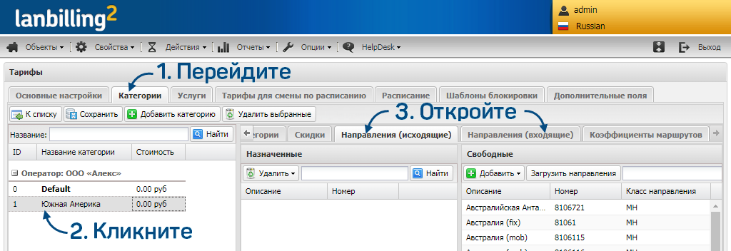 После того как вы создадите тариф телефонии или IP-телефонии, добавьте в него категории. Они нужны, чтобы сгруппировать направления в рамках одного тарифа и задать для них общие параметры. Например, в тарифе можно создать одну категорию для местной связи, вторую для междугородней, третью для международной. Затем определите, какие направления входят в категорию.