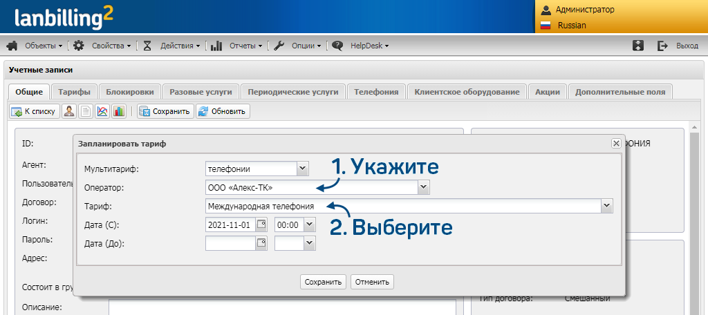 После того как вы создадите и сохраните учётную запись телефонии или IP-телефонии, в неё можно будет добавить дополнительные тарифы. Такое сочетание в АСР LANBilling называется мультитарифом.