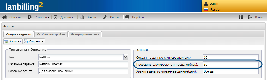 Проверять блокировки с интервалом — измеряется в секундах. Определяет, с какой частотой система будет проверять, заблокированы ли учётные записи, которыми управляет этот сетевой агент. Если запись заблокирована, агент может закрыть абоненту доступ в интернет — это зависит от настроек блокировки.