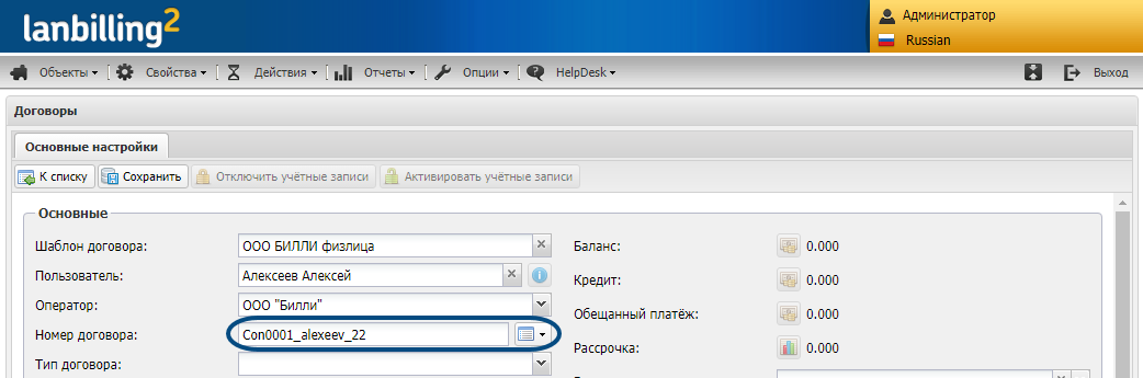 Договоры в АСР LANBilling нужны, чтобы работать с учётными записями. У абонента может быть один или несколько договоров. Например, авансовый договор для учётных записей с предоплатой и кредитный — для постоплатных.