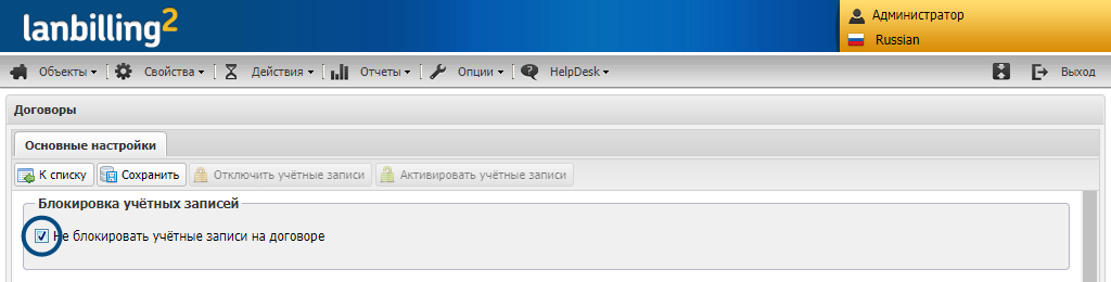 Во всех договорах есть флаг «Не блокировать». Он позволяет отменить настройки финансовой блокировки, заданные в тарифах. Если установить его, система не будет блокировать учётные записи на этом договоре.