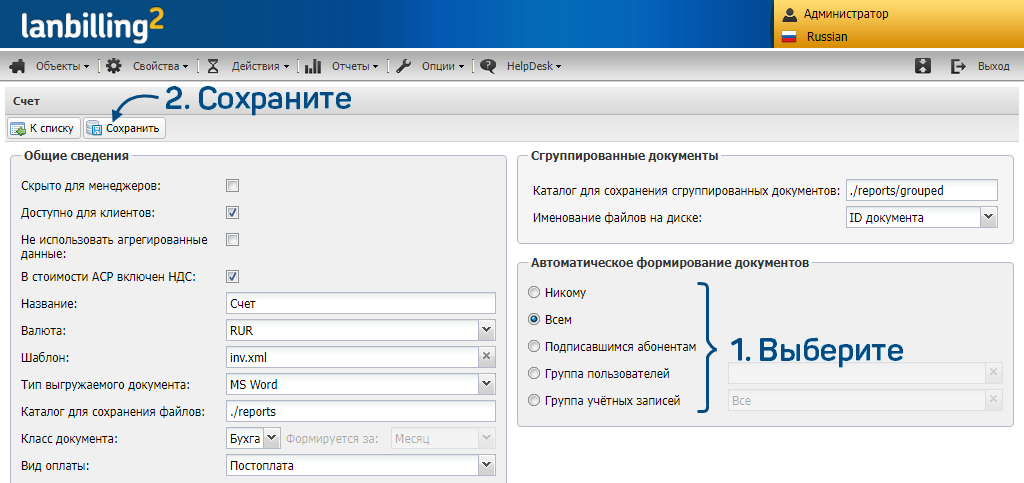 Чтобы ускорить этот процесс, настройте автоматическое формирование. По умолчанию оно отключено. Раз в месяц в определённый час АСР LANBilling будет формировать документы для всех абонентов или для выбранной группы. Менеджеру останется только отправить их или сохранить на компьютер.