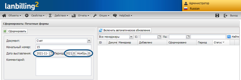 Пример. Если указать «15», то АСР LANBilling сгенерирует документы с номерами «15», «16» и т. д.