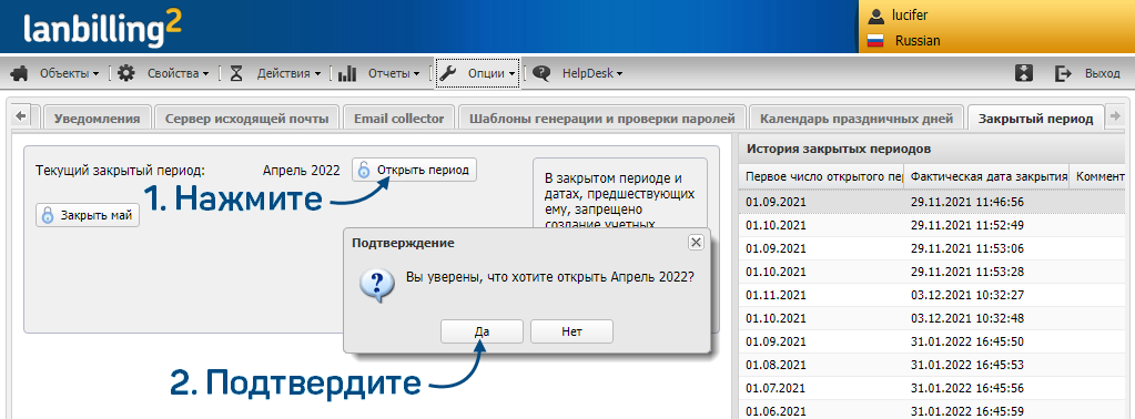 Чтобы закрыть период в АСР LANBilling, следуйте инструкции.