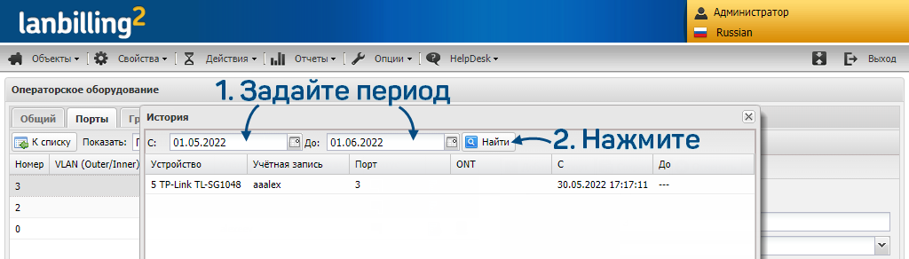 Порт операторского устройства может быть привязан к учётной записи или к порту другого устройства. Вы можете проверить, к каким объектам в разное время был привязан определённый порт.