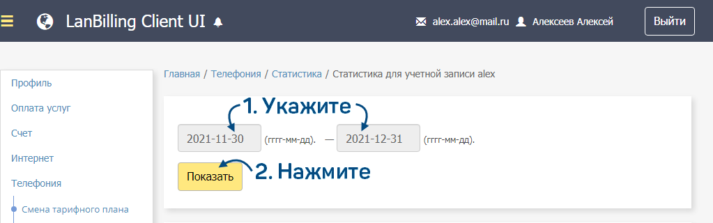Укажите период и нажмите «Показать». Система отобразит детализированную статистику для учётной записи.