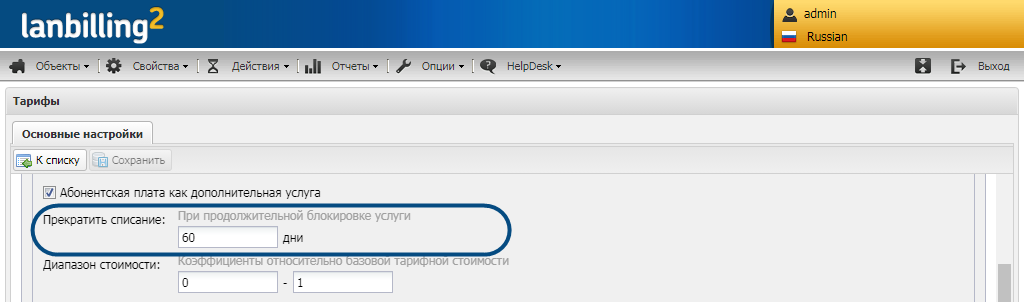 Пример. В тарифе заданы такие настройки: списания в конце каждого месяца, при финансовой блокировке — 500 руб., при административной — 100 руб. С 1 сентября учётная запись была заблокирована из-за отрицательного баланса, 3 сентября менеджер перевёл её в административную блокировку, а 15 сентября отключил. Значит, 1 октября с абонентского договора спишется 500 руб.