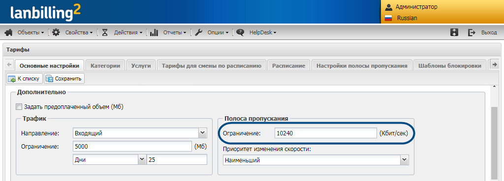 В блоке «Полоса пропускания» можно указать, какая скорость подключения будет доступна всем пользователям тарифа.